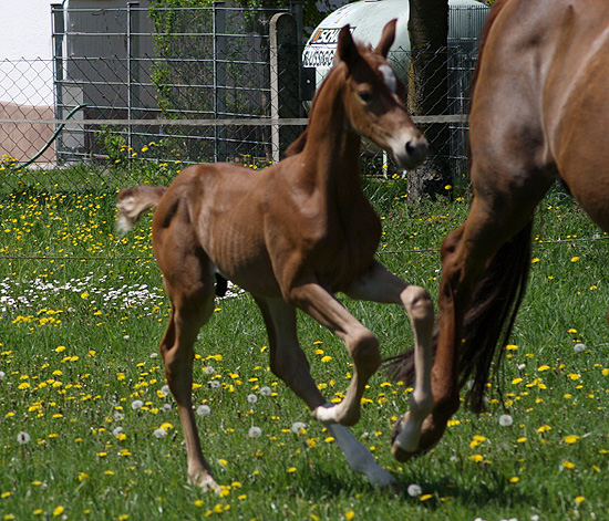 Und der Schluß macht Donröschen, ein kleine Prinzessin mit einem Schnäbelchen zum verlieben. Die Tochter des Don Juan de Hus aus unserer Sandro Hit-Stute Socienne ist am 18.5. geboren und besticht vom 1. Tag an durch Liebreiz, Charm und Bewegungsfreude. Super elegant bei bester Bewegungsgüte zeigt sich unsere kleine Ballarina, die ihrem Vater nicht nur in der Farbe ähnelt.