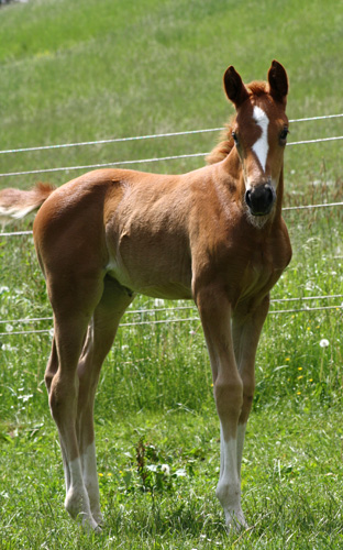 Das 3. Fohlen brachte unsere Weydentochter Weylind am 26.4. zur Welt. Ein Fuchsstütchen mit einem wunderschönen Gesicht und 4 gleichmäßig hochweißen Fesseln. Anfangs noch etwas schüchtern zeigt sich die Quadroneur-Tochter immer in einem tollen Seitenbild bei sehr guter Halsung und korrektem Fundament. Besonders der Schritt lassen bei den drei sehr guten GGA keine Wünsche offen.